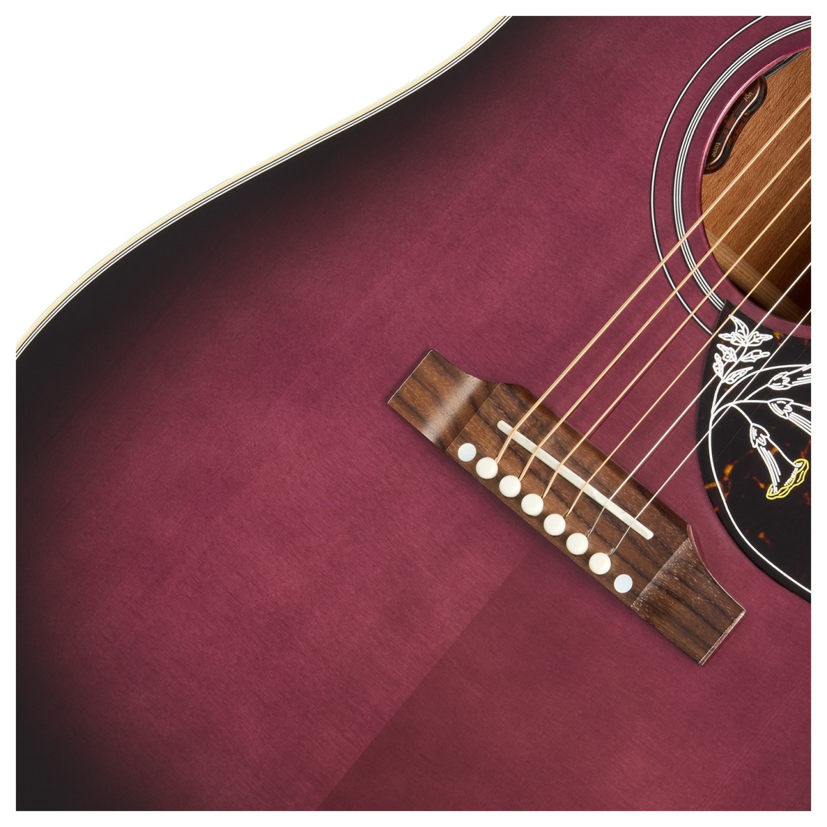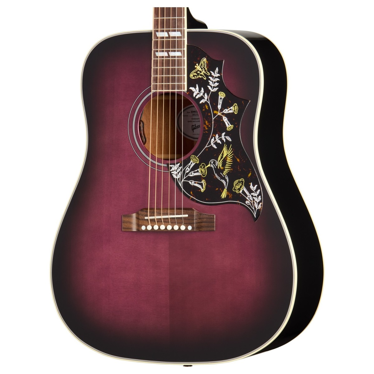 The Purple Burst finish sets off the Hummingbird’s signature pickguard artwork, nickel hardware, and crisp 5-ply/3-ply binding for a look that’s equal parts classic and modern. A reverse belly rosewood bridge anchors sustain and intonation, and the guitar ships in a fitted hardshell case so it’s road-safe from day one. It’s a standout instrument that looks as good as it sounds, on stage or in the studio.