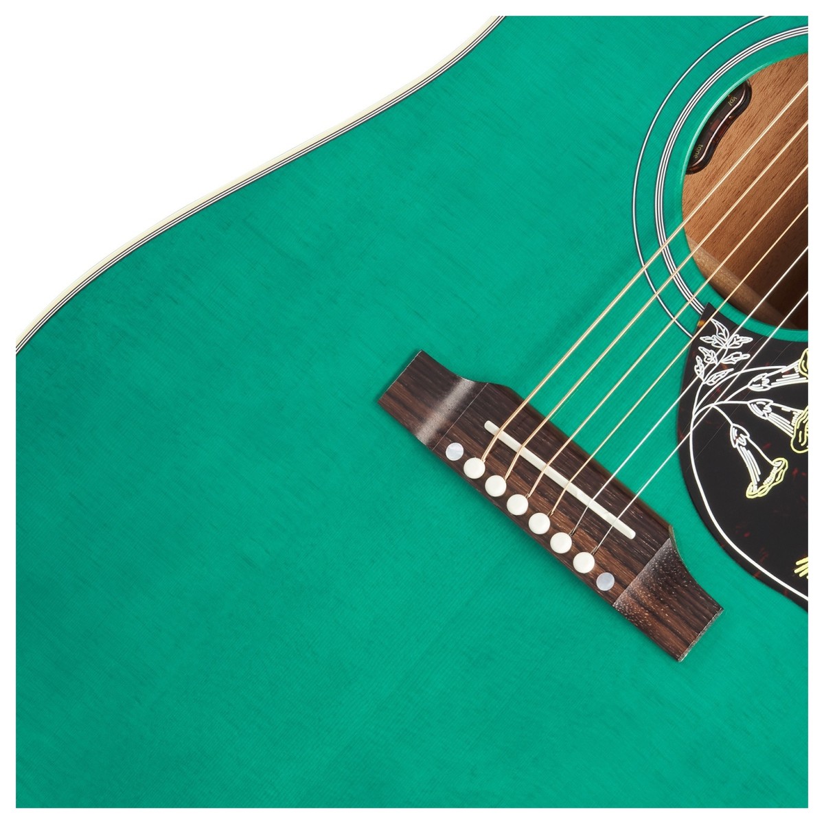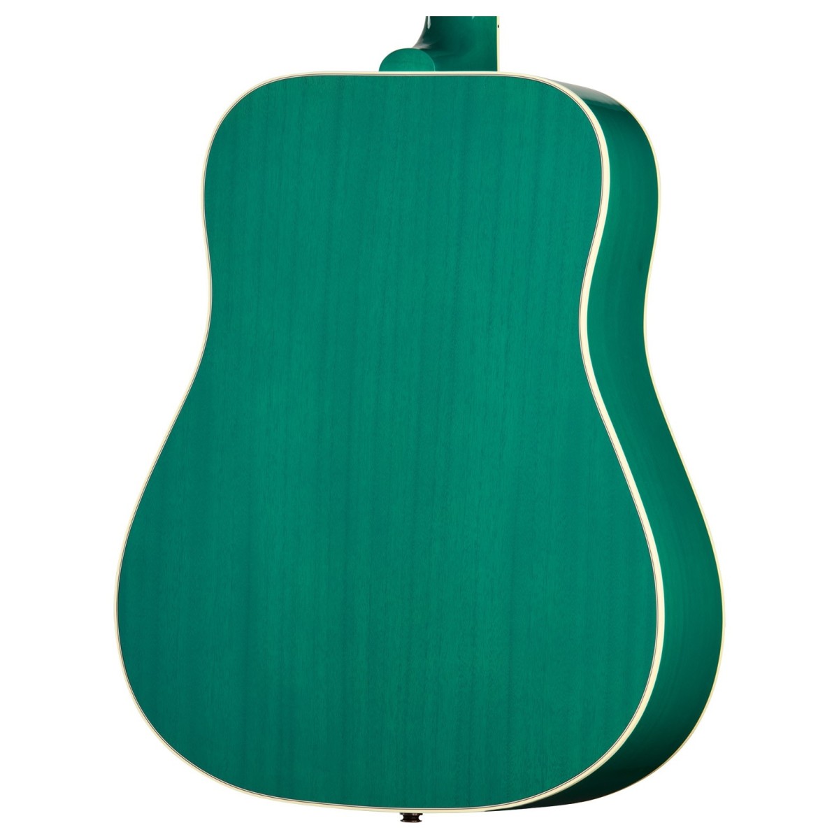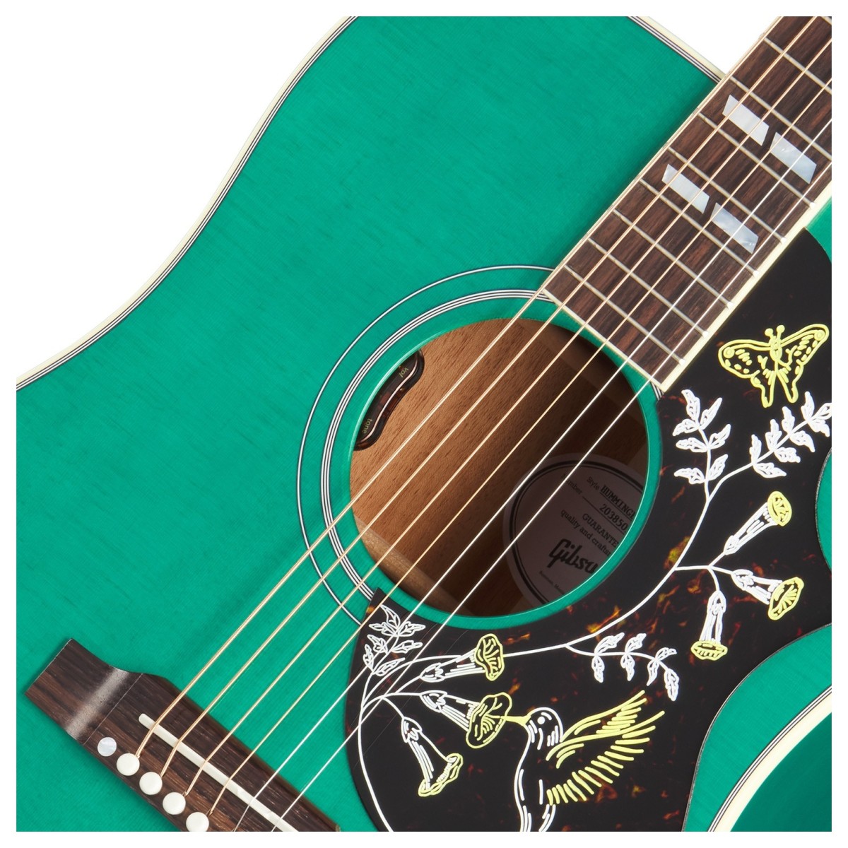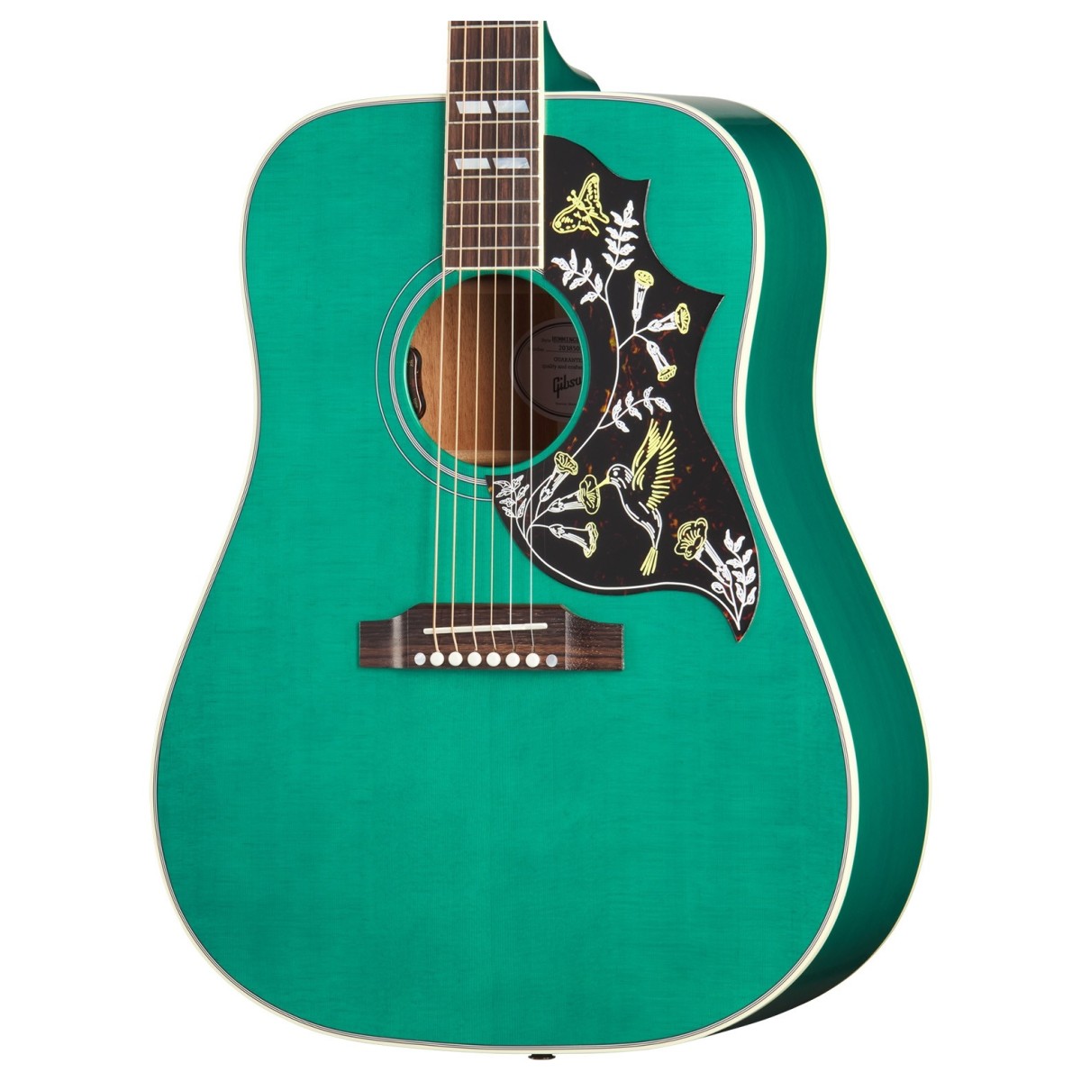 The translucent teal finish sets off the signature Hummingbird pickguard, crisp multi-ply binding, and nickel hardware for a look that turns heads under stage lights. A reverse belly rosewood bridge anchors intonation and sustain, and the guitar ships in a fitted hardshell case for safe travel. It’s a standout instrument that blends heritage styling with modern dependability from headstock to endpin.
