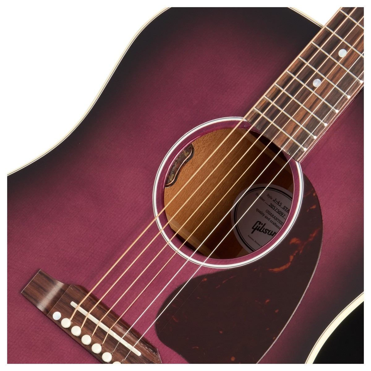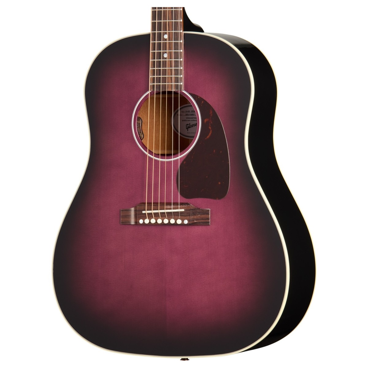 A SlimTaper mahogany neck and rosewood fingerboard provide smooth playability, while the compound dovetail neck joint enhances resonance and sustain. Simple mother-of-pearl dot inlays keep the look understated, complementing the teardrop pickguard and nickel hardware. A traditional rosewood belly-up bridge, paired with a TUSQ nut and saddle, ensures stability and precise intonation. Equipped with LR Baggs VTC electronics, the J-45 Standard is ready for the stage or studio straight out of its hardshell case. The Purple Burst J-45 continues the proud legacy of Gibson’s most celebrated acoustic model.