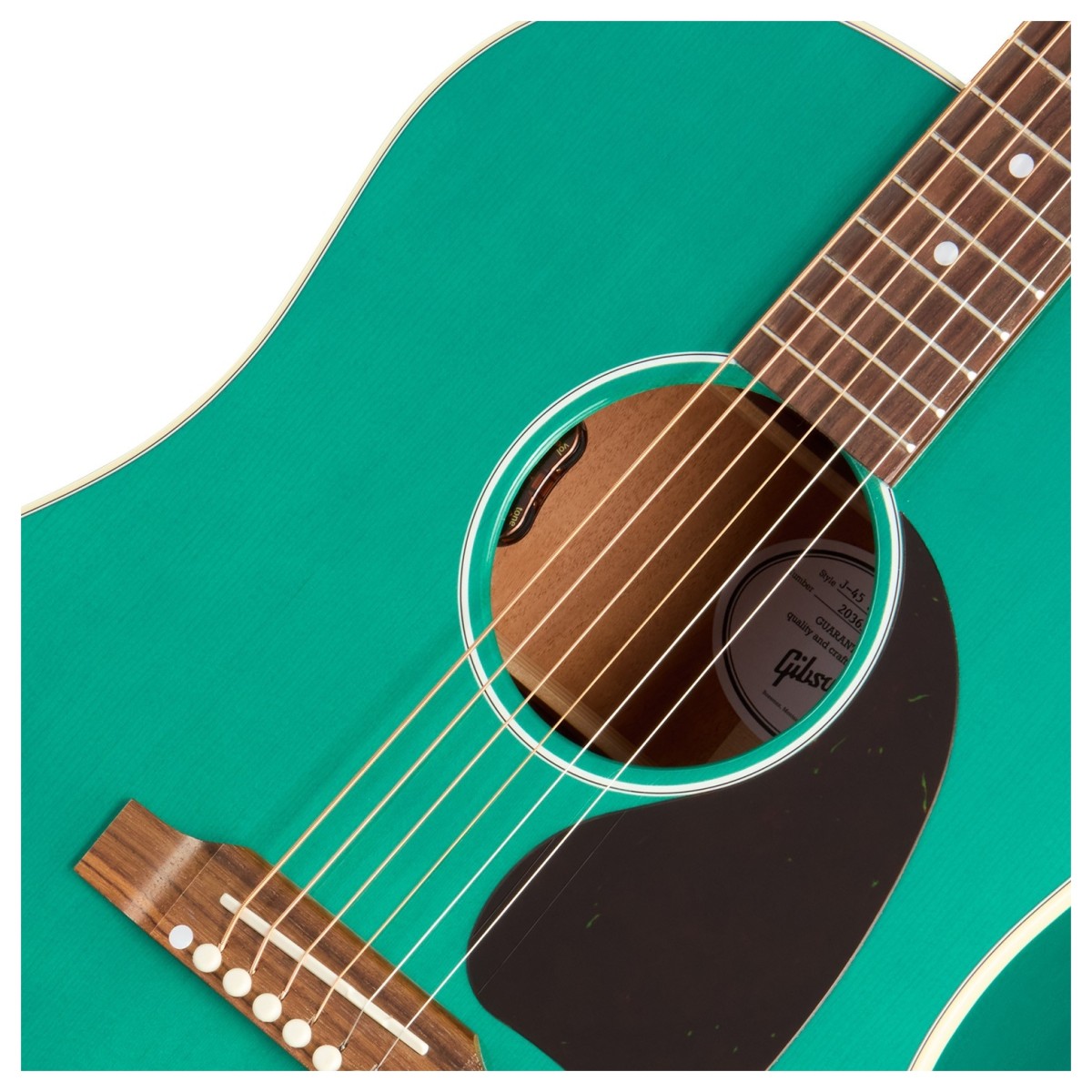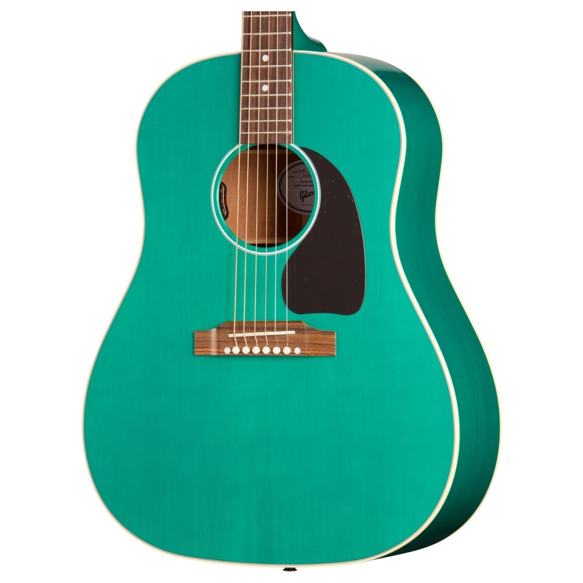 The Gibson J-45 Standard in Translucent Teal is a striking take on a legendary acoustic. Known as the “Workhorse” since its introduction in the 1940s, the J-45 has become one of Gibson’s most iconic and best-loved models. Its round-shoulder dreadnought design, solid Sitka spruce top, and mahogany back and sides combine to create a voice that’s rich, balanced, and full of character. Expect warm bass, sweet mids, and crisp trebles that cut through with clarity, making this guitar an inspiring partner for songwriting, recording, or live performance.