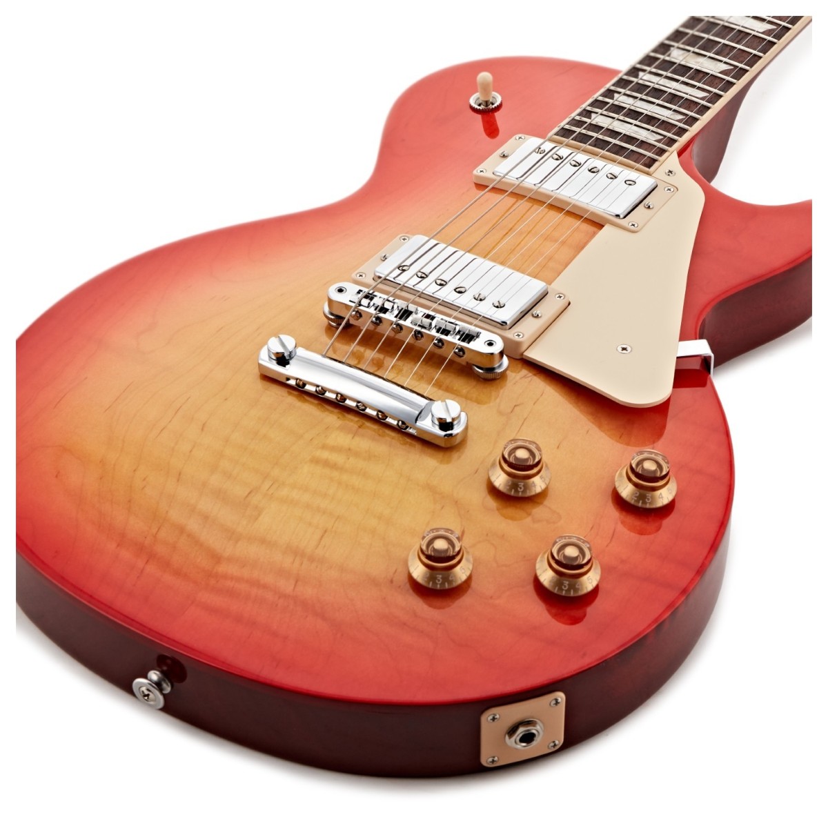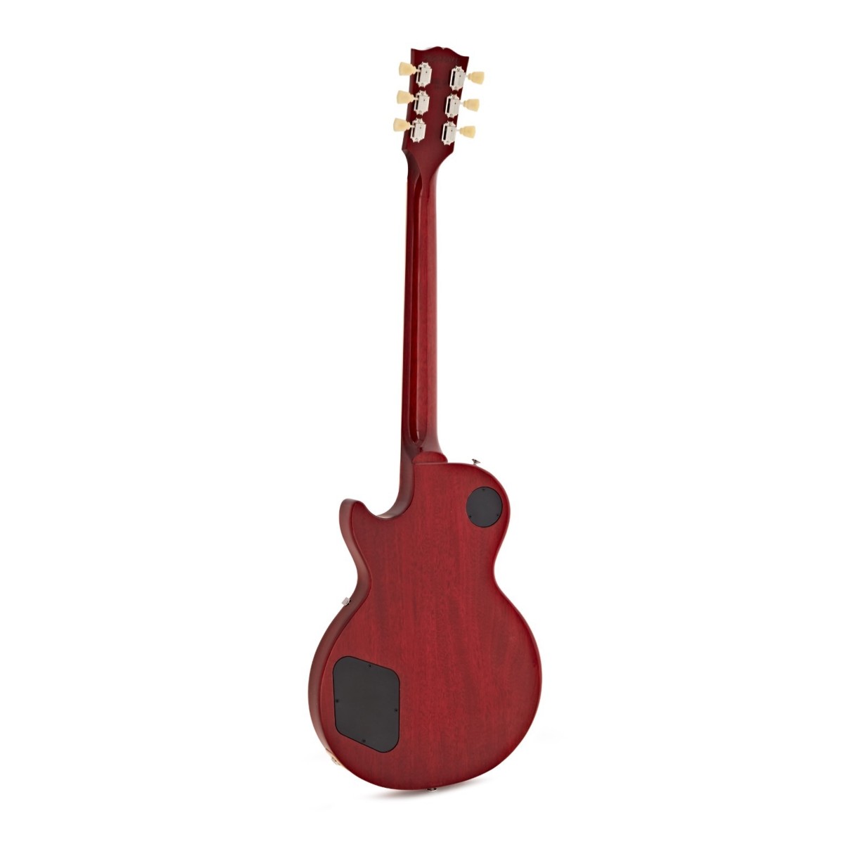 The Gibson Les Paul Studio Figured is a modern take on a classic workhorse, offering the unmistakable Les Paul sound and feel in a sleek, player-focused package. With an Ultra Modern weight-relieved mahogany body and a carved AA figured maple top, this guitar balances warmth, punch and brightness with comfort for long sessions on stage or in the studio. The gloss nitrocellulose finish in Washed Cherry Sunburst shows off the striking maple grain, while the bound rosewood fingerboard with trapezoid inlays adds a timeless touch of style. The glued-in mahogany neck with SlimTaper profile delivers fast, smooth playability, with 22 medium jumbo frets and a 12” radius making bends and chords equally effortless.