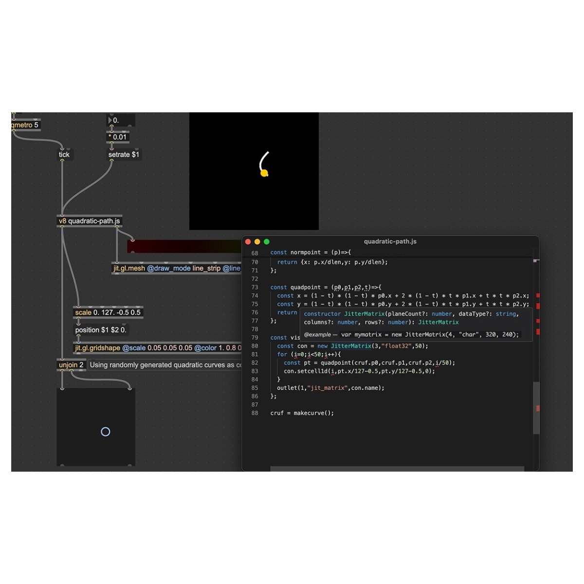 Si te gusta el texto, el Codebox de Max 9 y el JavaScript V8 actualizado engine proporcionan un control preciso sobre cada paso de un patch. Escribe la lógica, la secuenciación, el manejo de datos y el control DSP personalizado en código y, a continuación, intégralo a la perfección con los objetos gráficos. Este enfoque híbrido agiliza la experimentación y permite perfeccionar comportamientos, automatizar tareas complejas y crear módulos reutilizables. Incluso si eres nuevo en JavaScript, los ejemplos y la documentación facilitan el aprendizaje editando, probando e iterando directamente dentro de tu patch.